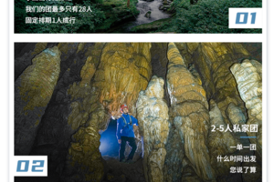 早餐后乘车前往盗梦空间探洞之旅,车上领队介绍洞内概况,讲解探洞知识。抵达目的地简单热身,领取并佩戴装备后徒步前往开展探洞,全程让人惊喜不断,各种钟乳石布满整个洞穴,清澈的地下河谷小河流淌,夏日时还可以在洞内溯溪戏水,体验探洞的新玩法。