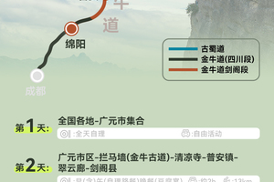 行程概览:我们早餐时间7点左右,早餐后出发前往“天下第一关”剑门关。登关楼俯瞰金牛道七十二峰,触摸姜维守关「一夫当关」石碑。挑战绝壁鸟道,贴千仞绝壁握铁链前行,在猿猱愁渡处与苍鹰并肩。随后乘车深入汉阳古蜀道核心段。踩过唐宋马蹄印青石板,听松涛裹挟千年驼铃残响。途经抄手铺古驿站,在残存栓马桩旁啜饮老荫茶,解码清代驿丞账簿的神秘符号。徒步结束后乘车前往剑阁县入住,晚霞中回望剑山如戟,完成从金戈铁马到商旅尘烟的立体穿越。