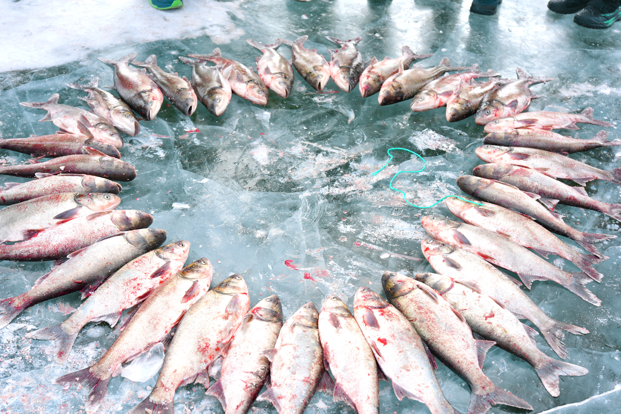 冬捕超级有仪式感,冬捕前一定要举行祭湖醒网的盛大仪式,“开湖头鱼”价值千金,是祥瑞的符号。