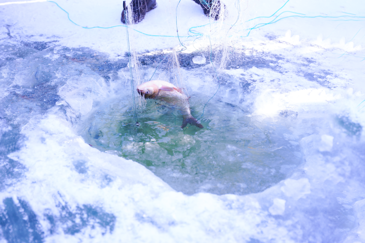 我们来到零下冰封的湖面,和当地老乡们一起冰上凿窟、撒网捕鱼、协作拉网…在鱼出冰面时,享受成功的狂欢。