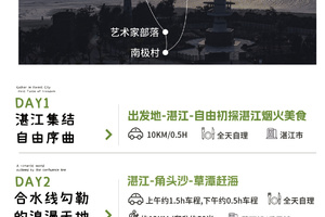 今日全天为集合日。根据您的出发地乘坐高铁动车前往[湛江西站、湛江北站]、绿皮车火车[湛江站],或航班前往[湛江吴川机场],后自行前往市区酒店办理入住。抵达较早的队员,可自由探索湛江:前往赤坎老街感受人文底蕴,或观海长廊,打卡军港等。别忘了用一顿地道的美食开启粤西味觉之旅。