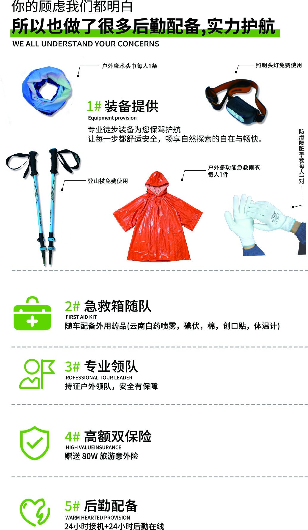 4.活动提供装备中说明的:头灯1个/登山杖1对免费使用(用后回收,如需要双杖请提前告知),赠送一次性雨衣/头巾/手套(不回收)