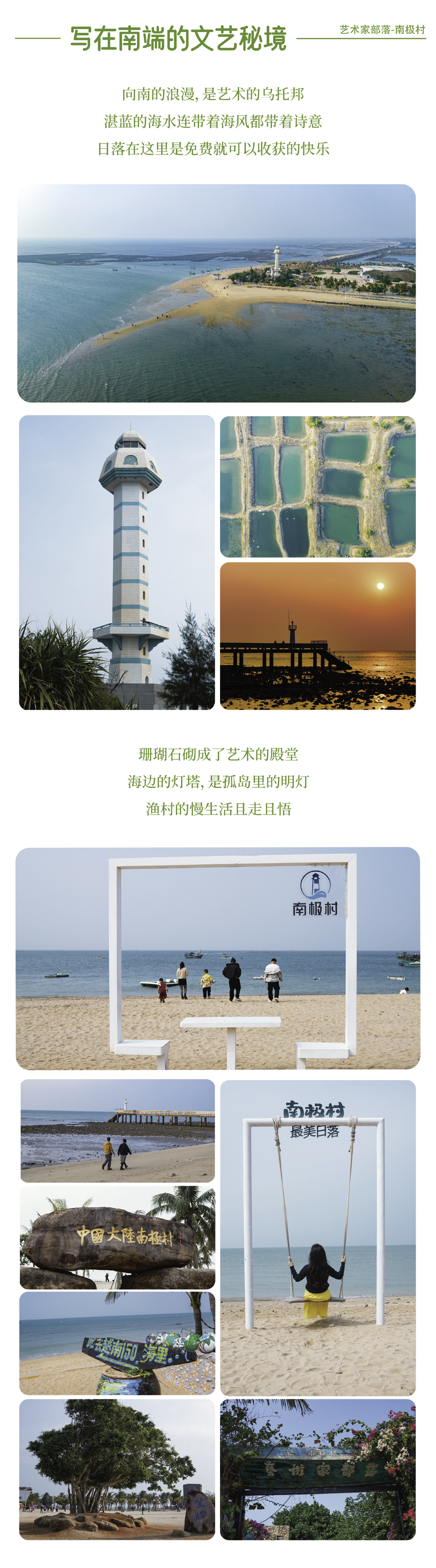 早餐后,开启最后一天的徒步旅程。从南极村艺术家部落出发,沿珊瑚礁保护区沙滩漫步前行,途中可打卡网红景点、拾捡贝壳,最终抵达中国大陆最南端【南极村灯楼角】。在此欣赏“合水线”奇观,并完成南极村的打卡留念。
