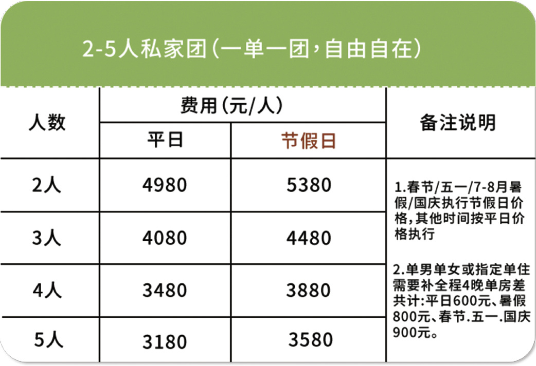 ➂ 单房差:单人报名默认同性拼房(拼房不成功无需另付单房差);指定单住或1成人带1儿童(需补全程4晚单房差价共计:平日600元/暑假800元/春节.五一.国庆900元)2人一起报名默认住1间房(如需分开住请主动说明)