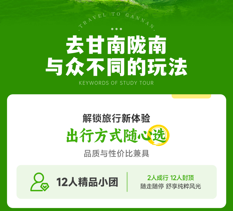 3、行程结束当天18:00左右抵达兰州西站,大家可以依据自己的时间,自行选择继续游玩或是启程回家。火车建议购买19:30以后的车次,高铁建议购买19:00以后的车次,飞机建议购买21:00以后的航班。兰州西站距离兰州中川机场约68公里,车程约1.3小时。大家根据自己的航班车次选择返程票。