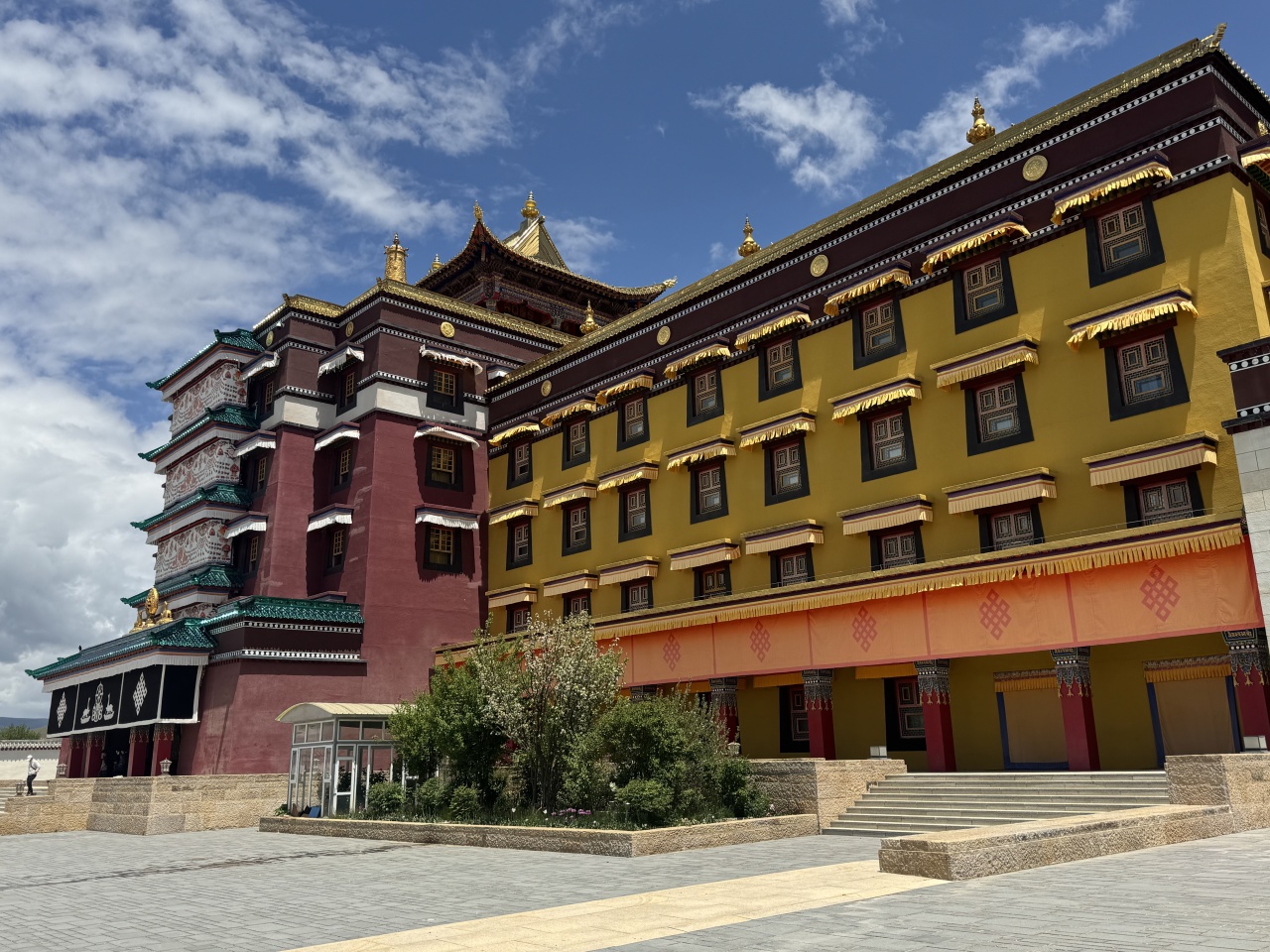 随后继续驱车前行,前往观赏【米拉日巴佛阁】(55km,车程1小时,游览30分钟)。米拉日巴佛阁位于合作市东北部,是藏传佛教噶举派(白教)的代表性建筑之一,也是目前藏区唯一一座供奉米拉日巴尊者的佛阁。佛阁共9层,高40余米,建筑风格独特,融合了藏、汉两种建筑艺术特色,墙体上绘有精美的藏传佛教壁画,阁内供奉着米拉日巴尊者及诸多佛、菩萨造像,宗教氛围浓郁。