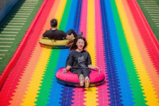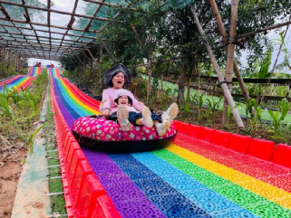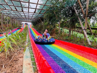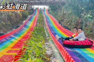 一条很好看的七彩滑道,非常热门的亲子项目,顺着波浪弧度一滑到底,瞬间感觉失重心跳,滑行过程尖叫不断,玩的不亦乐乎,非常解压。