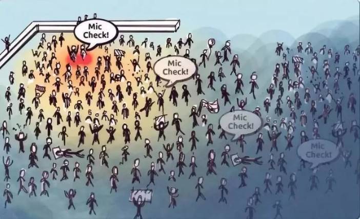 这种人体麦克风的工作过程很简单:一个人在小圈子里讲话,他每讲短促的一句,围拢的人就集体重复这句话。