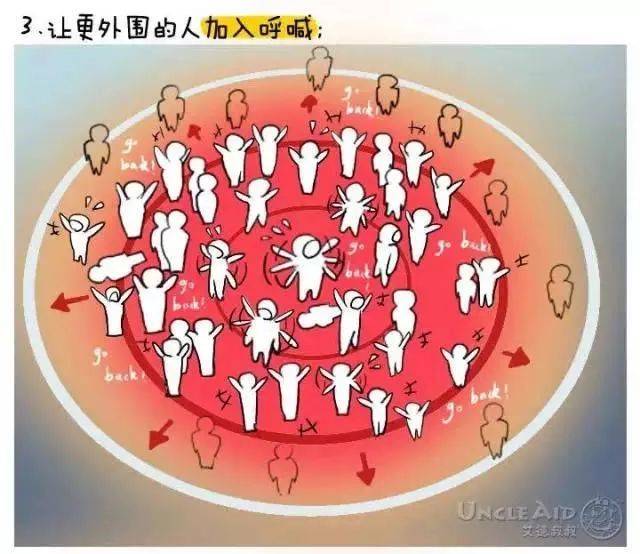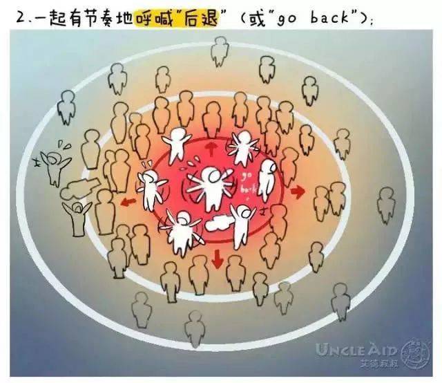 当你意识到可能会发生踩踏危险或已发生了踩踏,要迅速与身边的人(前后左右的五六个人即可)做简单沟通,要求大家迅速协同行动,你先喊“一、二”(或one,two),然后和周围人一起大声喊“后退”(或“goback”),如此有节奏地反复呼喊。