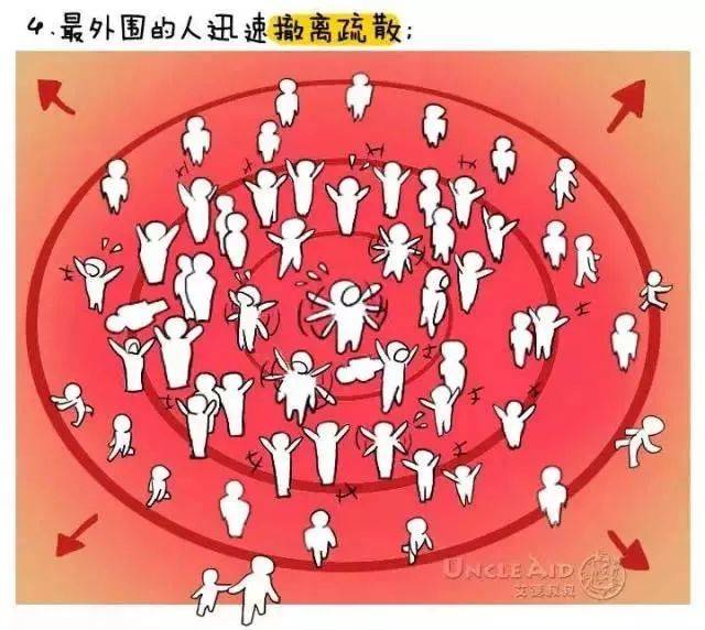 此时你要立即向外撤离,并尽量让你周围的人也向外撤离,同时尽量劝阻其他人进入人群。