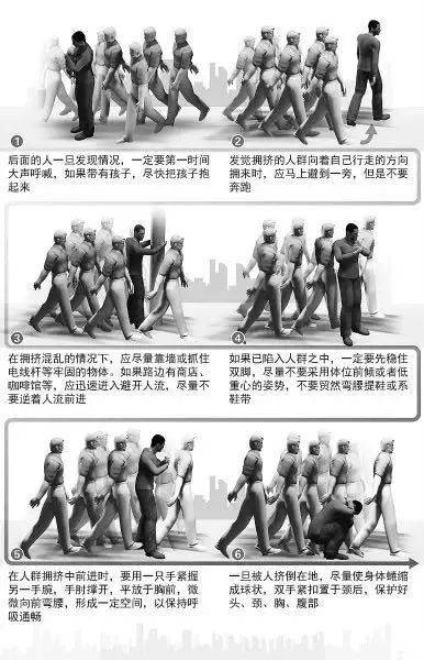 人多的地方防踩踏,谨记六字保安全:一躲二逃三护四抱五喊六缩: