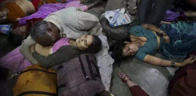2013年2月10日发生在印度阿拉巴德(Allahabad)踩踏事故的遇难者,丈夫想要保护妻子,但根本无力阻挡人群的力量。这起事件造成36人身亡。图片来自(AP PHOT/Kevin Frayer)🔽