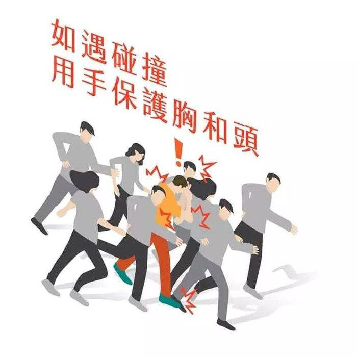 1. 若在前行中开始感到被推撞,不要尝试对抗阻力或加快脚步,这样可能会令自己跌倒而被压住。 如在前行中被推前,应保持镇定,顺着前方斜角方向继续前进,至出口处离开