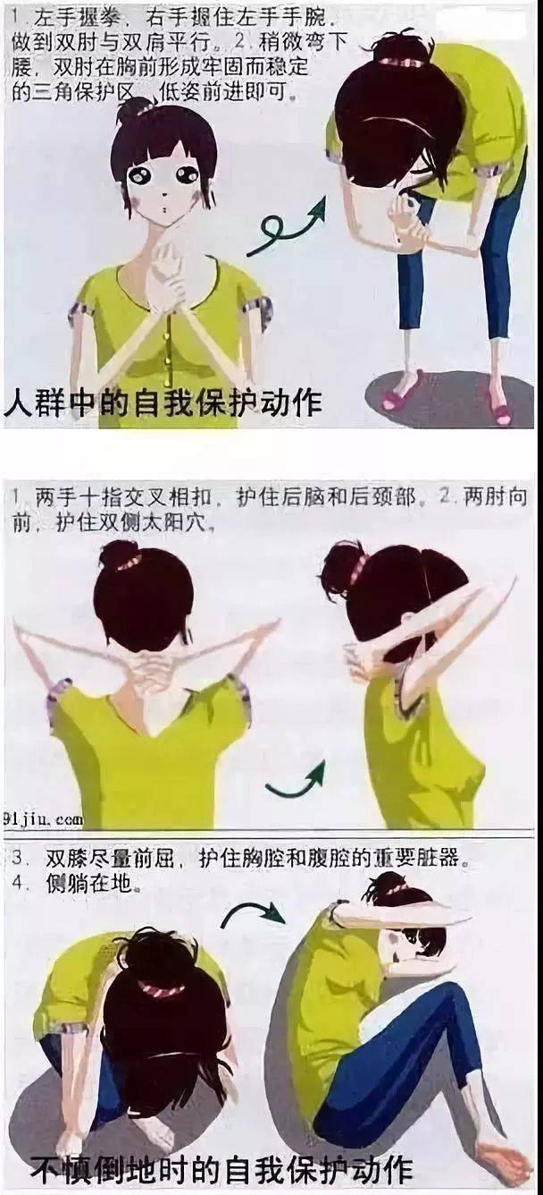 2. 如果被推撞,用手保护自己慨头和胸部,动作就像打拳一样,这样能保护最易受力而致命慨部位,步行时要踏实稳步。