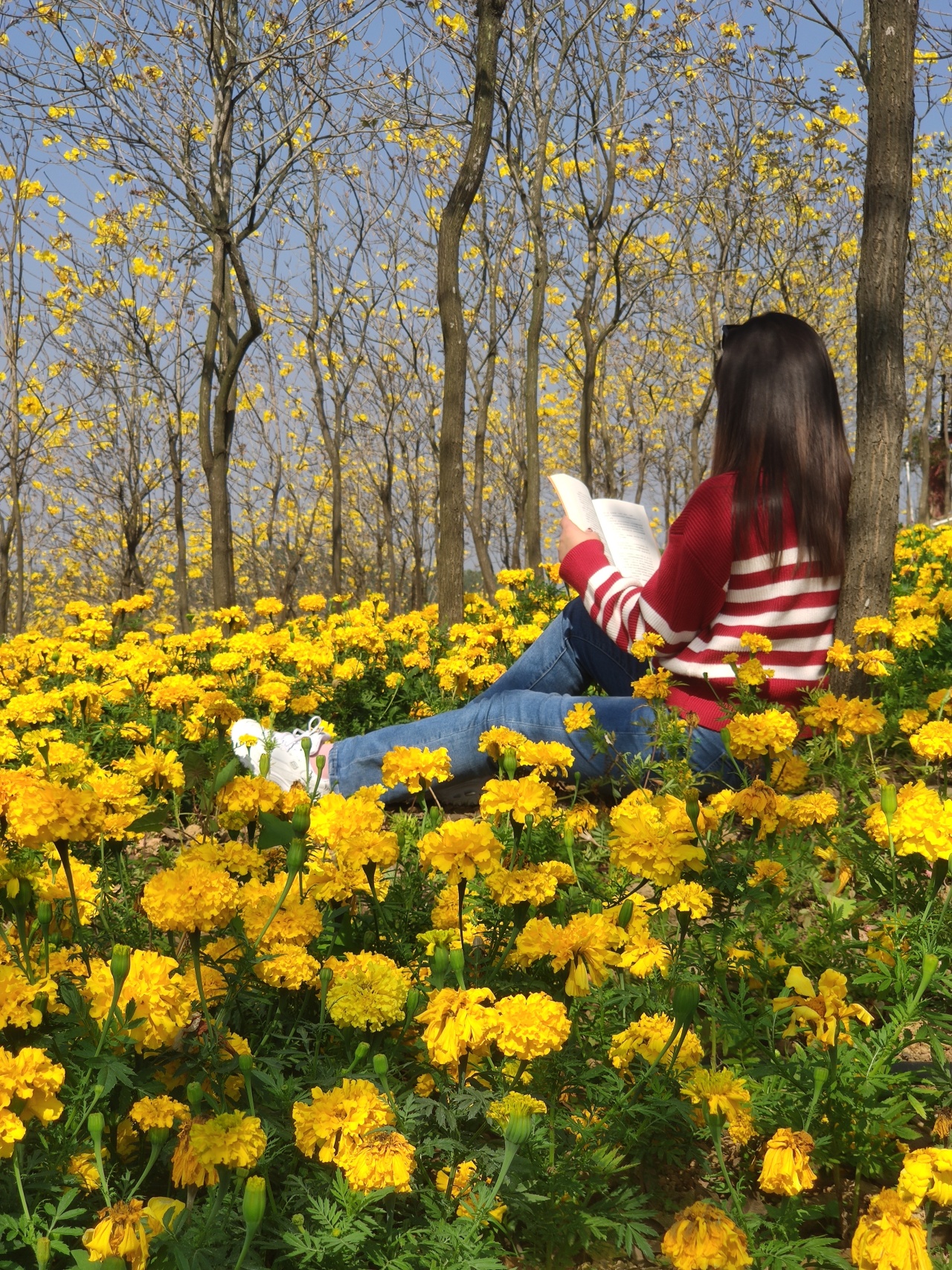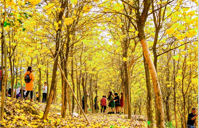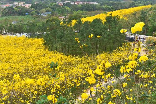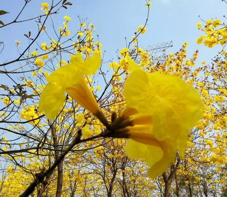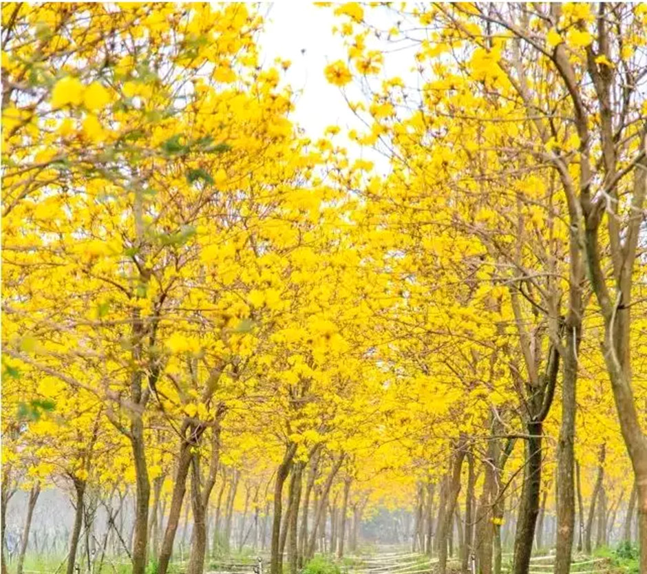 1万多株黄花风铃,步入林中,只见黄灿灿一片,树下五彩缤纷,满树黄花不见一片叶子,真正是满城尽带黄金甲