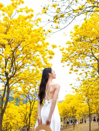 华南最大黄金风铃木立体花海,此处黄金风铃木种植超过五年。沿着粗壮的树干抬头望去,枝繁叶茂,一片金黄遮天蔽日,阳光经过花海过滤分外柔和,游人如置身童话隧道,却享受着春日意境独有的浪漫。
