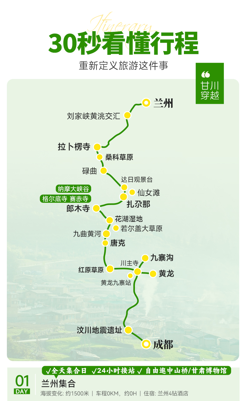 1、兰州集合当天,2人及以上免费赠送接机/站服务,请您提供航班信息/高铁车次。