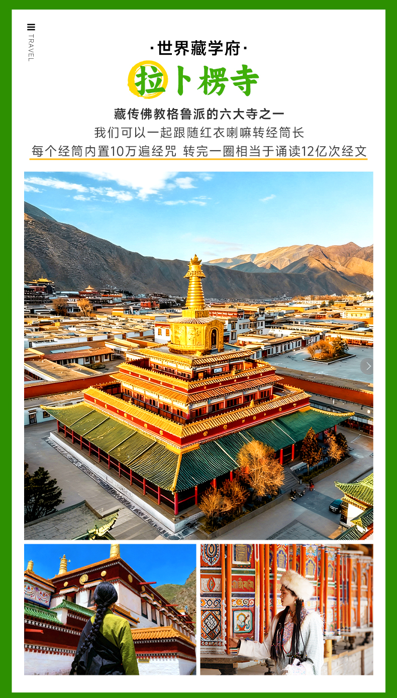 随后前往藏传佛教格鲁派的六大寺之一的【拉卜楞寺】(车程约155公里,用时3小时,游玩约2-3小时),这里保留有全国ZUI好的藏传佛,被世界誉为【世界藏学府】。