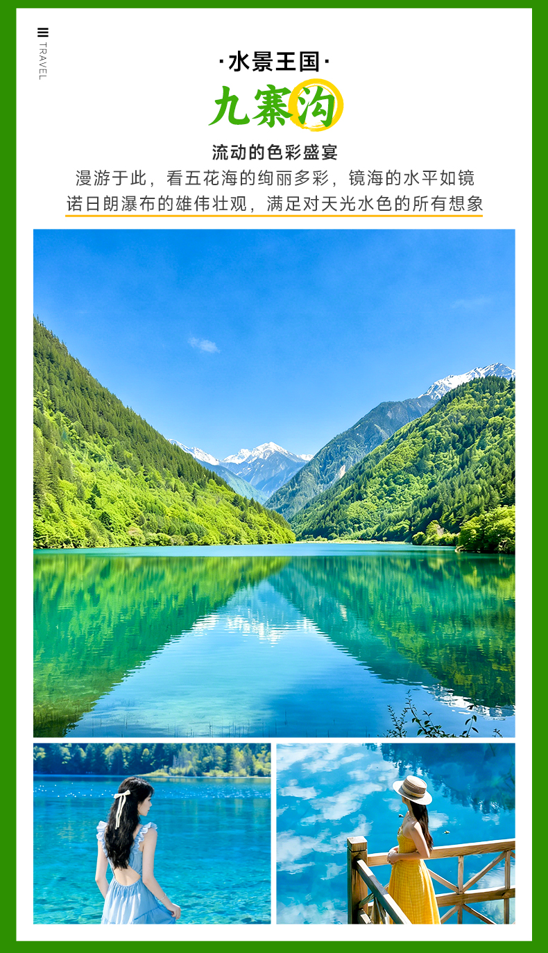 九寨沟的风景四季都十分迷人各有特色,春时嫩芽点绿,瀑流轻快;夏来绿荫围湖,莺飞燕舞;秋至红叶铺山,彩林满目;冬来雪裹山峦,冰瀑如玉。