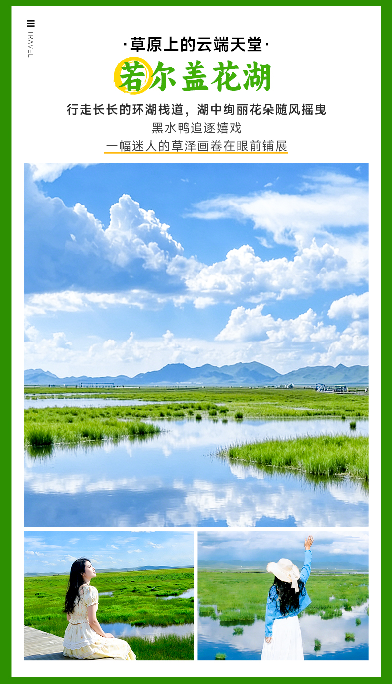 【若尔盖花湖】(车程约35KM,车程约40min,游玩约2-3小时),镶嵌在川西北高原的“天空之镜”,是中国ZUI美的湿地明珠之一。夏季来临,3000余亩的湖面化作缤纷花毯,狼毒花、格桑花与鸢尾花在碧水间肆意绽放,黑颈鹤优雅掠过如镜湖面,留下圈圈涟漪。木质栈道蜿蜒深入湿地,倒映着流云与远山,仿佛行走在水天交界处。秋日水草泛金,冬季冰晶凝玉,四季轮回间始终保持着遗世独立的纯净。随后途径【若尔盖草原】。
