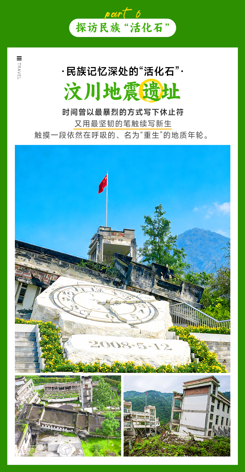 早餐后,乘车前往黄龙九寨站(行程约4公里,车程约20分钟)需要在此乘高铁的队员可在此解散。随后来到【汶川地震遗址】(行程246公里,车程约4.5小时,游玩约1小时),被誉为“民族记忆深处的活化石”。时间曾以最暴烈的方式写下休止符,又用最坚韧的笔触续写新生。触摸一段依然在呼吸的、名为“重生”的地质年轮。