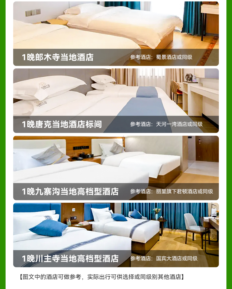 夜幕将至,在尽兴游玩后,我们将前往【九寨沟】县城(车程约100公里,用时约1.5小时)入住酒店休息。