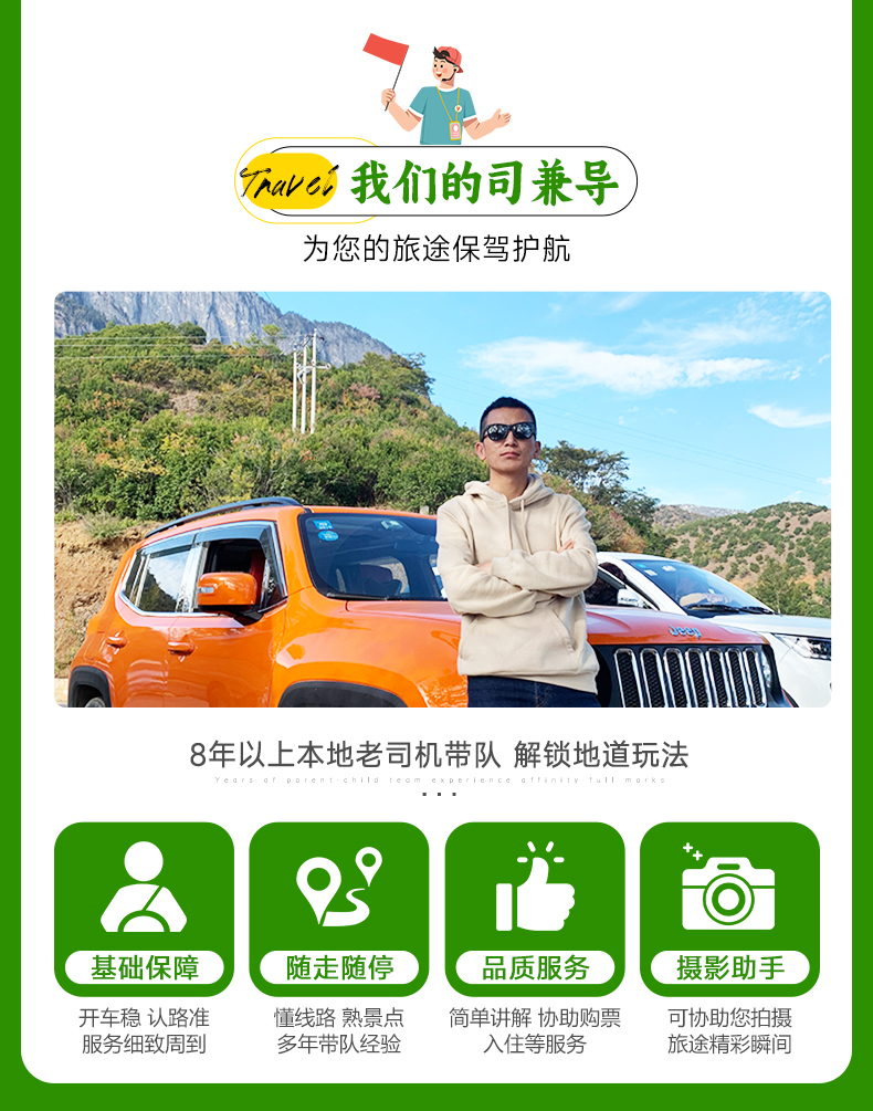 5、领队:司机兼领队(司机仅提供向导、代办住宿等服务;无法像专业领队一样提供讲解、景区伴游等服务!)